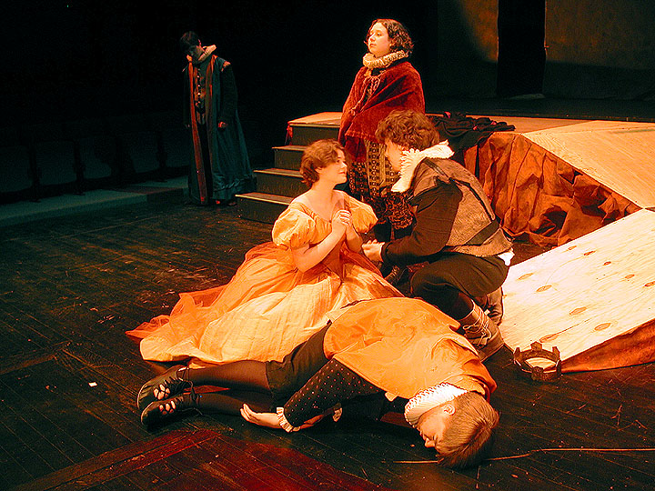 The Players rehearse their pantomime. Background: Sam Blair as the Player. Foreground: from left to right: Emily Thomforde as Alfred/the Player Queen; Alyssa Timin as one of the spies; Les Fox as the Poisoner (Lucianus); and Hollis Easter (lying down) as the Player King.